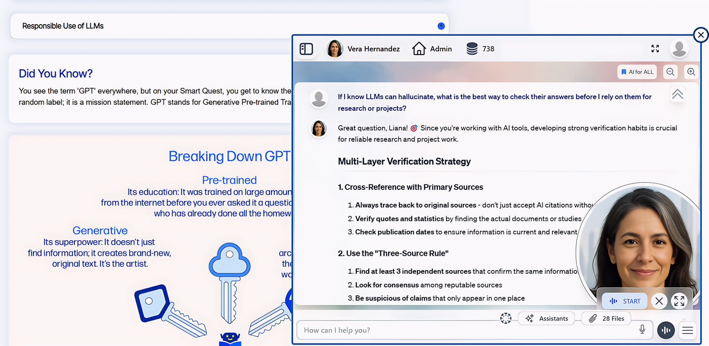 In the AI for All course, your AI Learning Coach is Vera Hernandez, a Chief Learning Navigator of AI Innovation City. Vera brings a cross-generational perspective on AI literacy, drawing on her background as an educator and cultural bridge builder. She helps learners see AI not as a replacement for human potential but as a powerful tool for augmentation, inclusion, and growth.