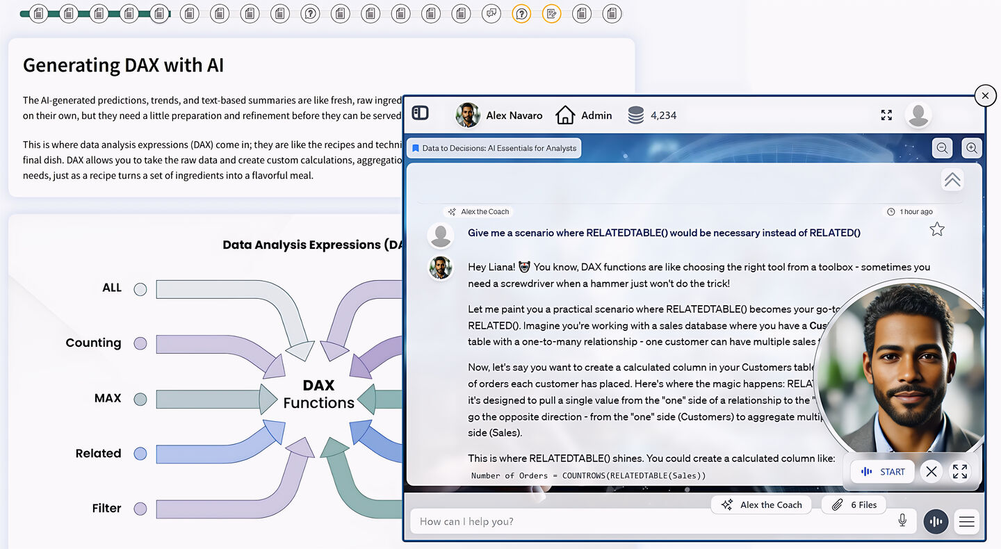 Our Data to Decisions course pairs you with AI learning coach Alex Navaro, a virtual guide with deep knowledge in AI for data analytics. Alex tailors his approach to your profession, goals, and industry, providing timely and relevant feedback to help you succeed.