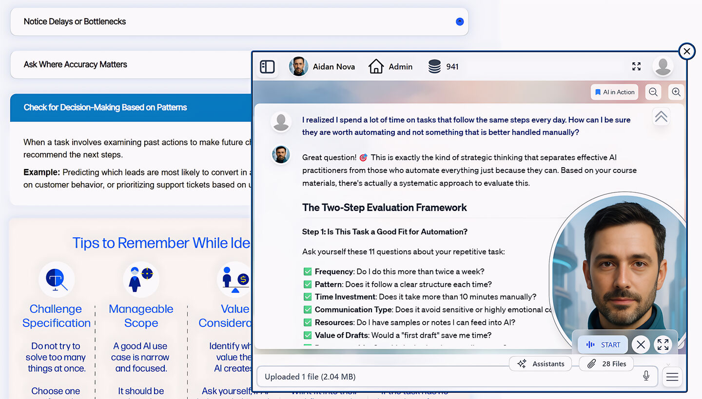 From the start, Aidan, your AI Learning Coach, challenges you to put AI into practice with clarity and purpose. He guides you to uncover opportunities for automation, build practical solutions using modern tools and platforms, and reflect on ethical considerations. See how Aidan pushes you beyond theory and builds the confidence you need to innovate in real world contexts.